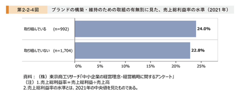 中小企業がブランディングに取り組むメリットは明確です。価格だけで比較される状況から脱却し、「なぜこの会社を選ぶのか」という明確な理由を顧客に提供できるようになります。たとえば、同じ品質の製品を扱う2社があった場合、企業の理念や姿勢が伝わっている会社のほうが、多少価格が高くても選ばれやすくなります。実際に、中小企業庁の「2022年版中小企業白書」によると、ブランドの構築・維持に取り組んでいる企業は、取り組んでいない企業と比べて売上総利益率が高い傾向にあります。