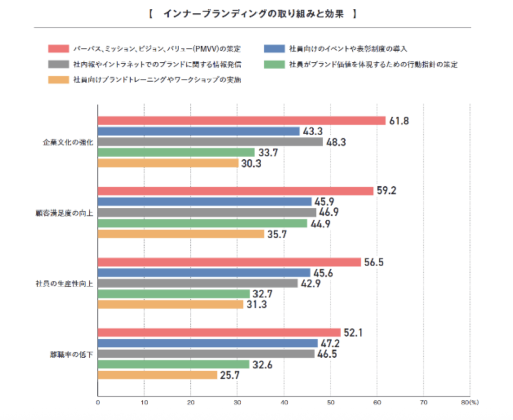 また、既存顧客に対してもブランドの一貫した体験を提供することで、ロイヤルティ(愛着度)が高まりリピート率が向上します。タナベコンサルティングの「2024年度ブランディングに関する企業アンケート調査」によると、コーポレートサイトの運営が採用人材の確保に貢献していると回答した企業は56.9%にのぼり、インナーブランディングへの取り組みが顧客満足度の向上(59.2%)や離職率の低下(47.2%)にも寄与していることが示されています。